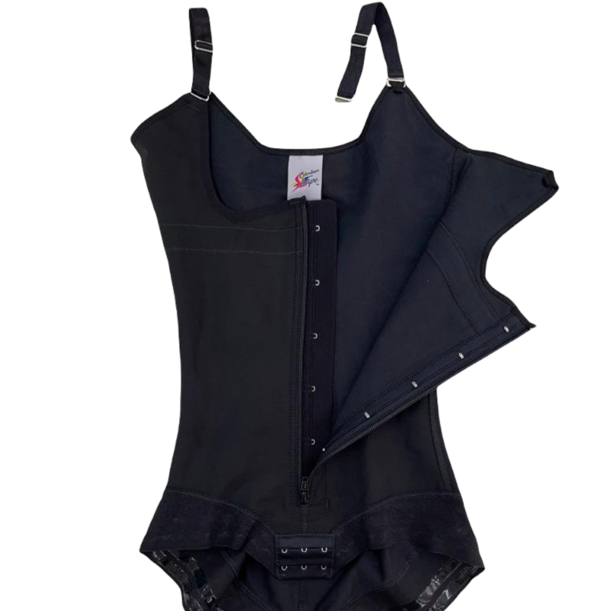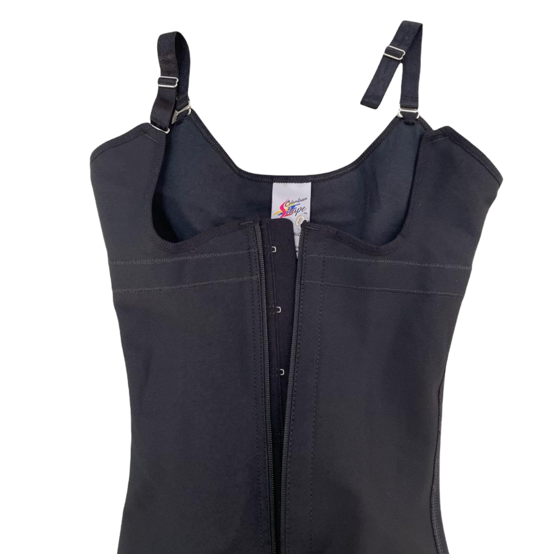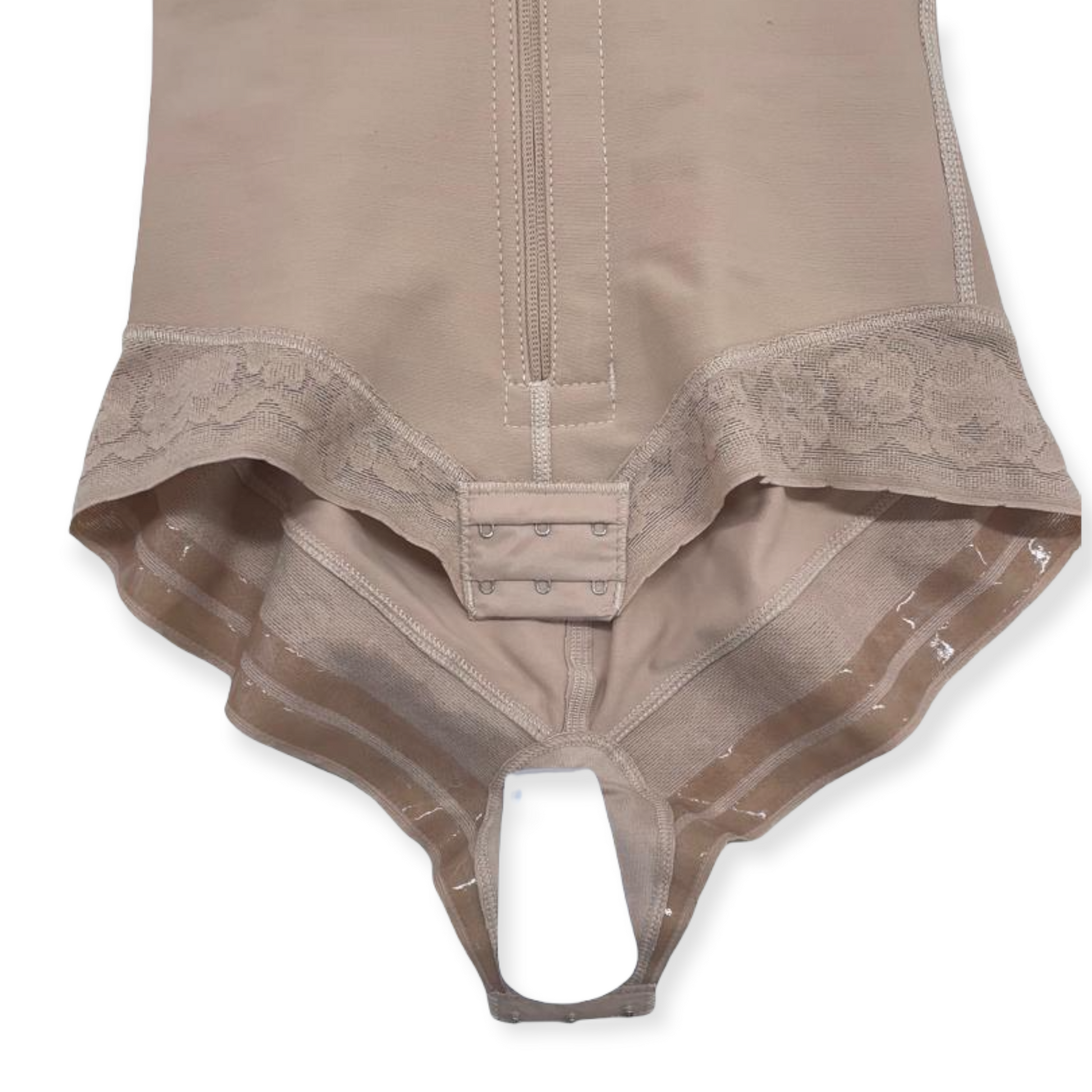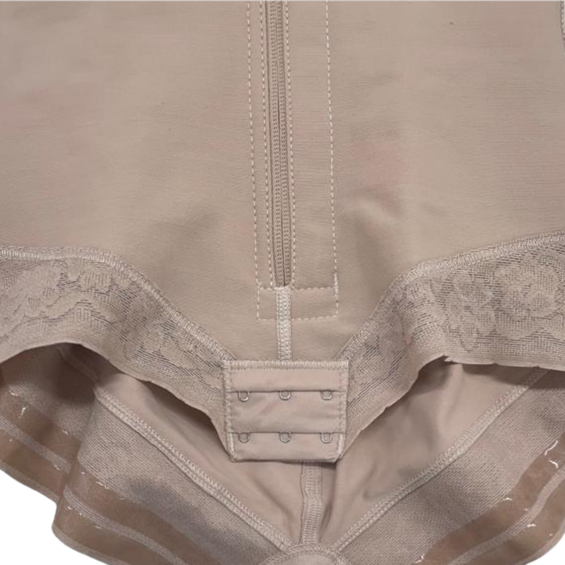 DESIGNED with POWERNET to give AWESOME COMPRESSION to ABDOMINAL AREA. It has a LATERAL LINE OF HOOKS WITH PERINEAL ZIPPER. The UNDER WEAR with LACE LINING gives a PERFECT SEAMLESS LOOK under tight clothing. It has THIN REMOVABLE/ADJUSTABLE STRAPS. In the CROTCH AREA it has TWO LATERAL LINES OF 3 ADJUSTABLE HOOKS to easily USE THE RESTROOM. The HIGH BACK DESIGN gives EXCELLENT UPPER BACK SUPPORT.