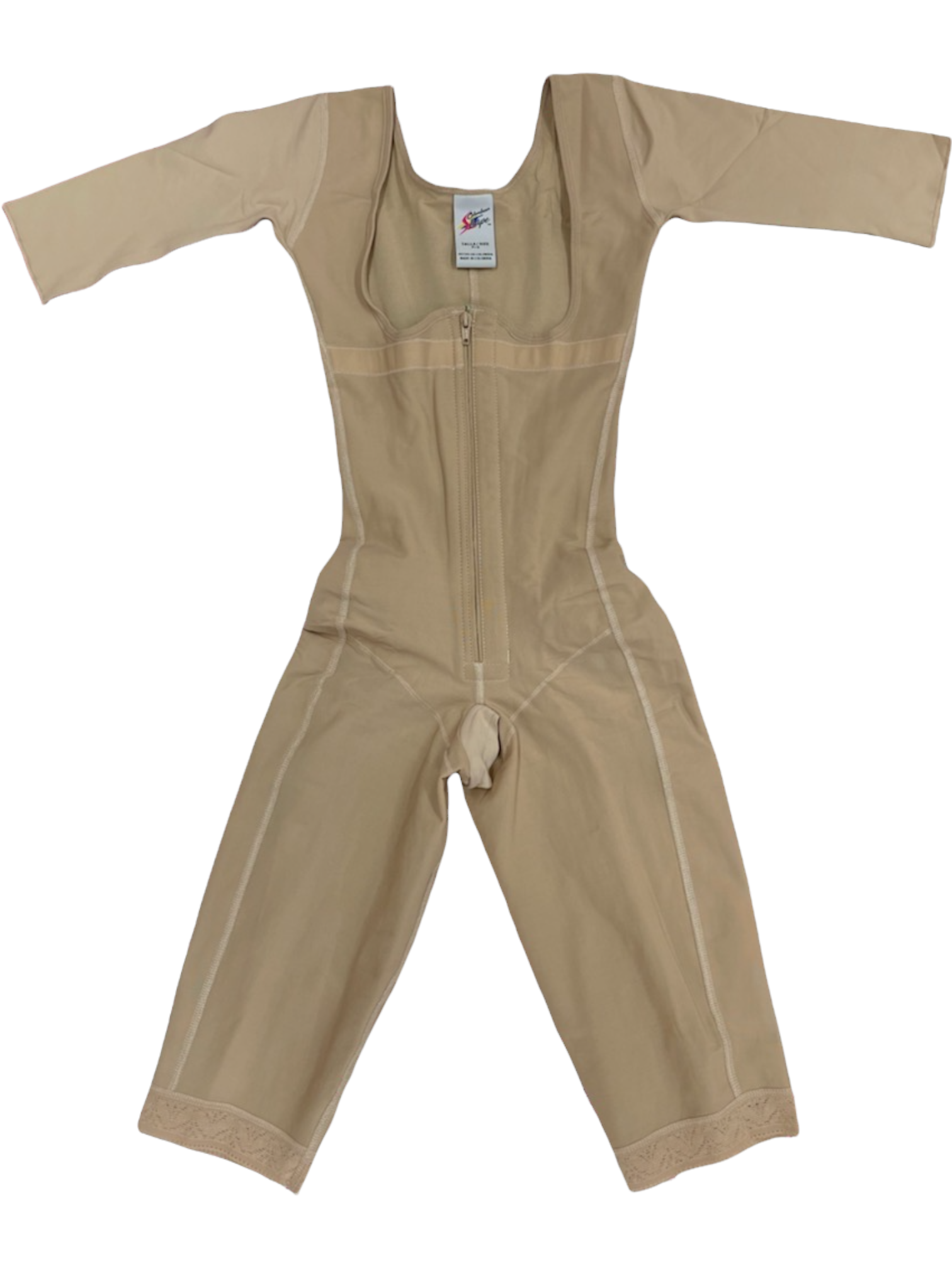 OUR CS640 FAJA LONG WITH ARMS NO BRA WITH BUTTLIFT THIS FAJA IS FOR DAILY USE, IT HELPS SHAPE THE WAIST, LEGS, AND ARMS. IT IS MADE OF POWERNERT WITH INTERNAL HYPOALLERGENIC COTTON IN THE AREA OF THE ARMS AND BUTTOCKS FOR BETTER COMFORT, IT HAS A FRONTAL ZIPPER AND AN OPEN CROTCH.